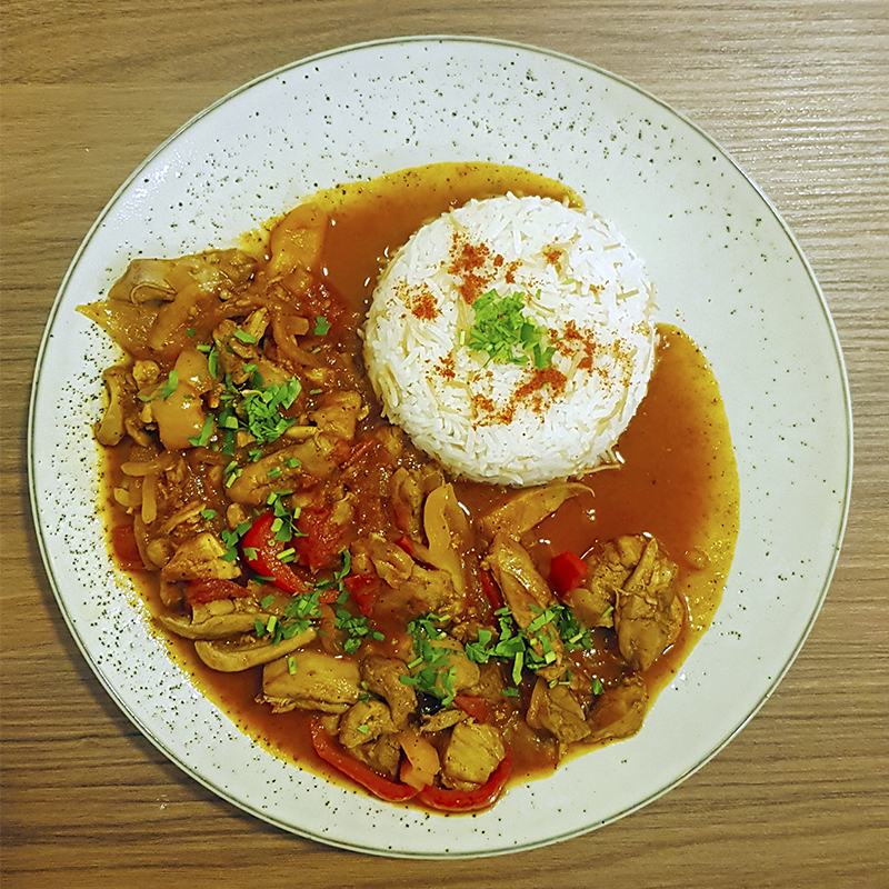 կանաչ բիբարով եփված հավի միս, մատուցվում է բրնձով