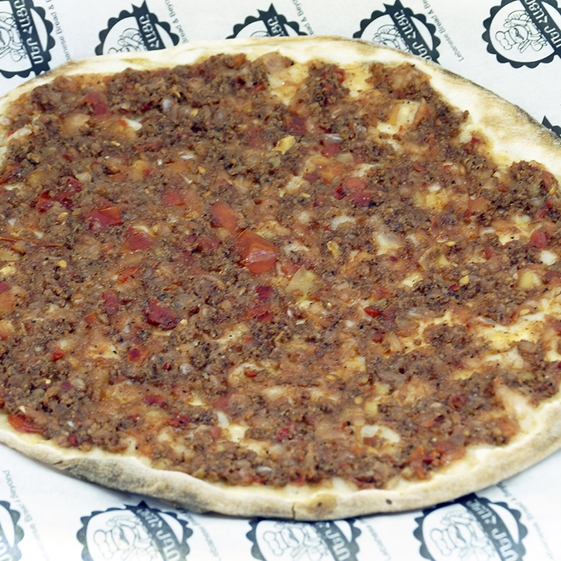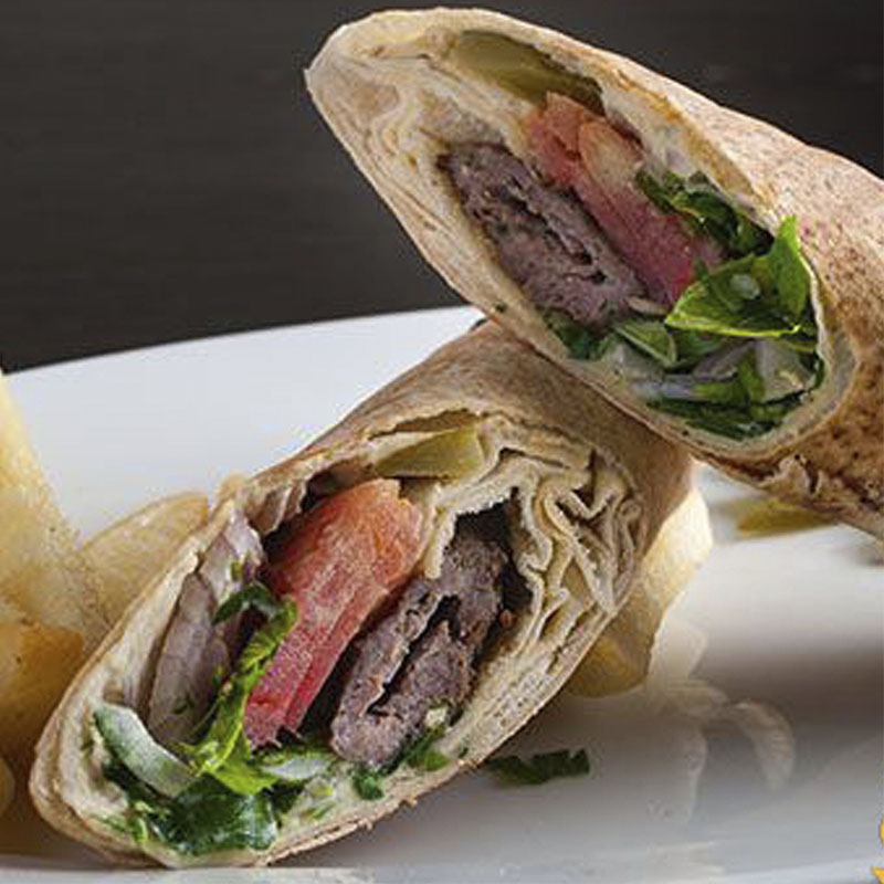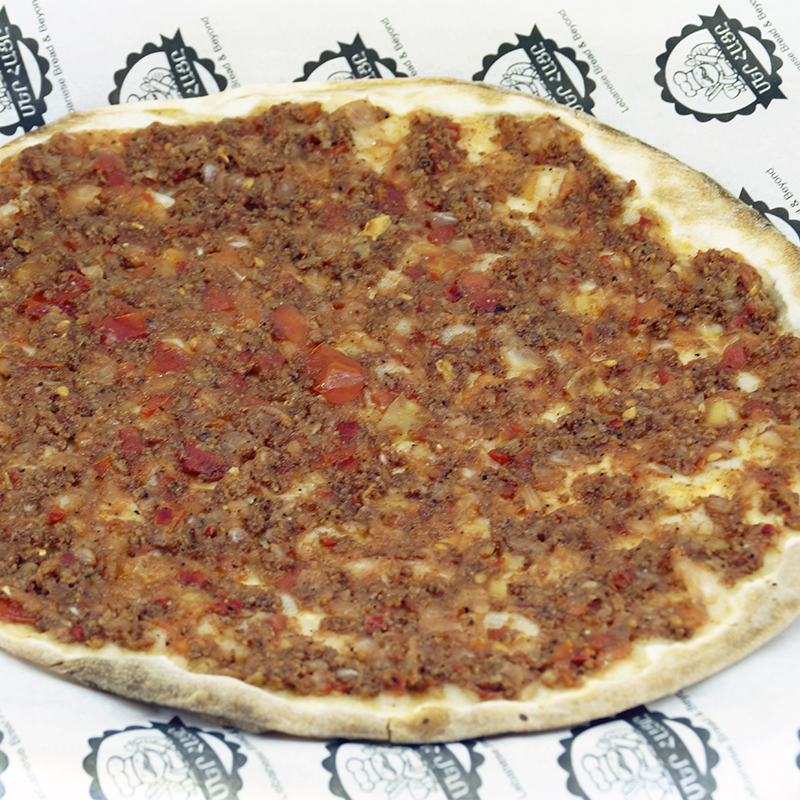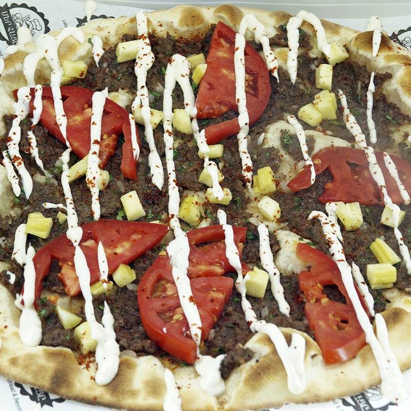 համեմված տավարի աղացած միս, հումուս, թթու, բիվազ, լոլիկ