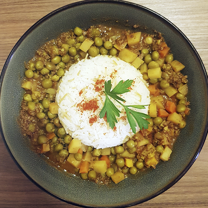 տավարի մսով եփված ոլոռ լոլիկի հյութով, մատուցվում է բրինձով