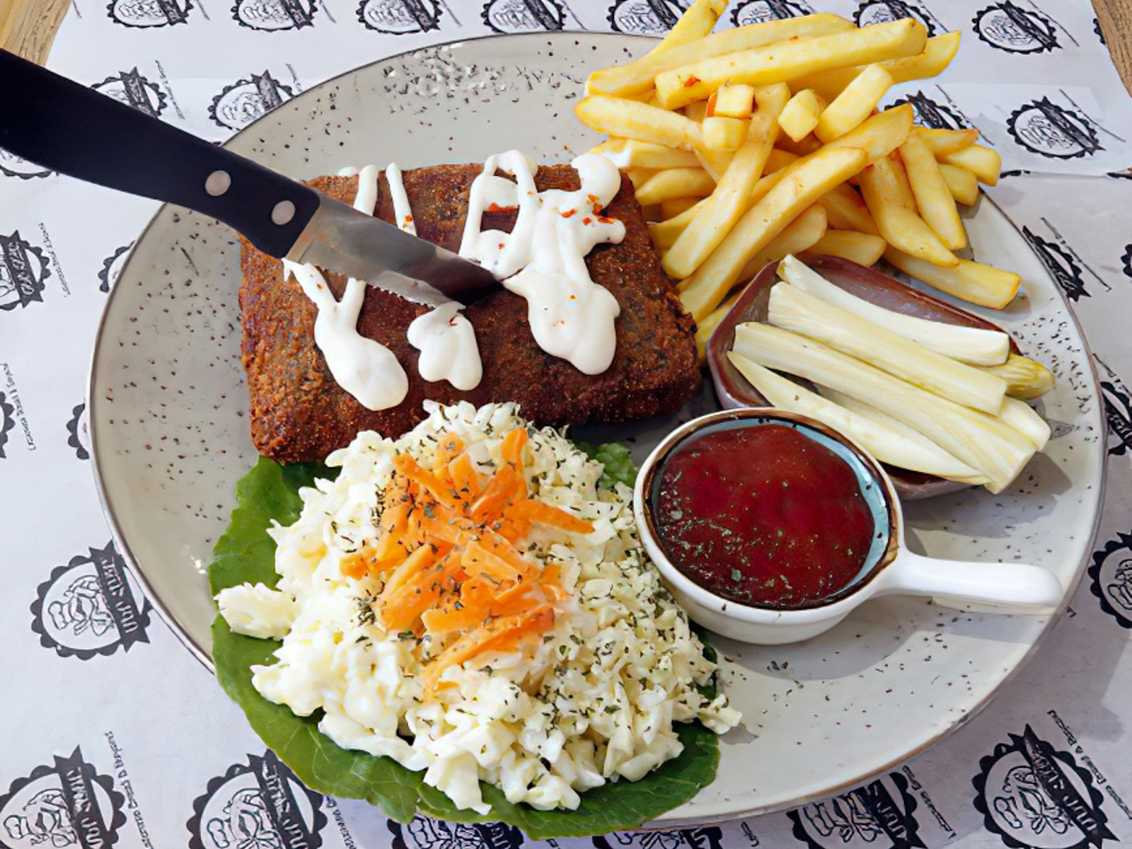 խրթխրթան հորթի միս պանրի և խոզապուխտի միջուկով, մատուցվում է կարտոֆիլ ֆրիով