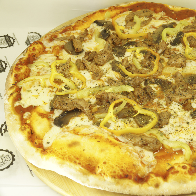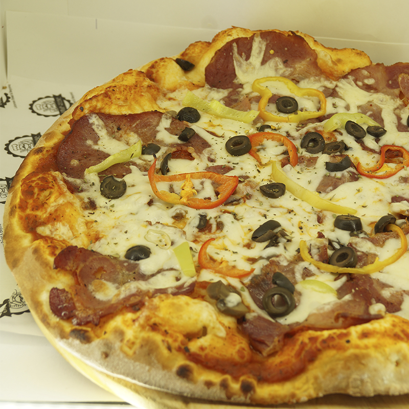 պիցայի սոուս, խոզապուխտ, սունկ, պղպեղ, մոցարելլա պանիր, ձիթապտուղ